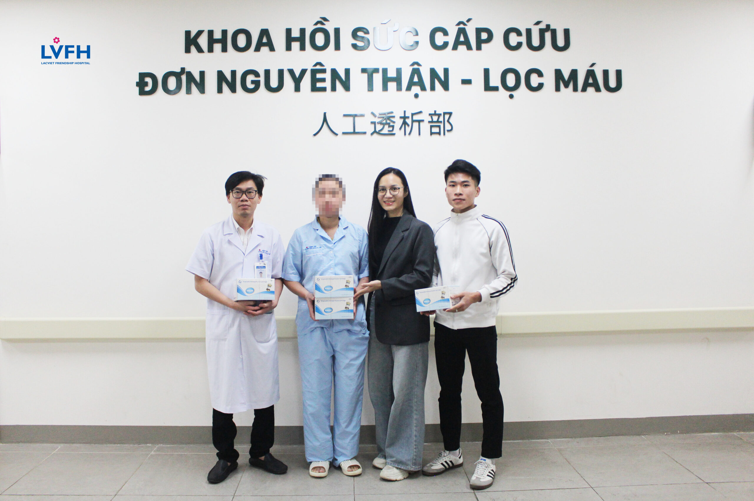 Đại diện Công ty TNHH Thanh Phương trao tặng quả lọc hấp phụ điều trị suy thận mạn cho các bệnh nhân đang chạy thận nhân tạo tại Đơn nguyên Thận – Lọc máu.