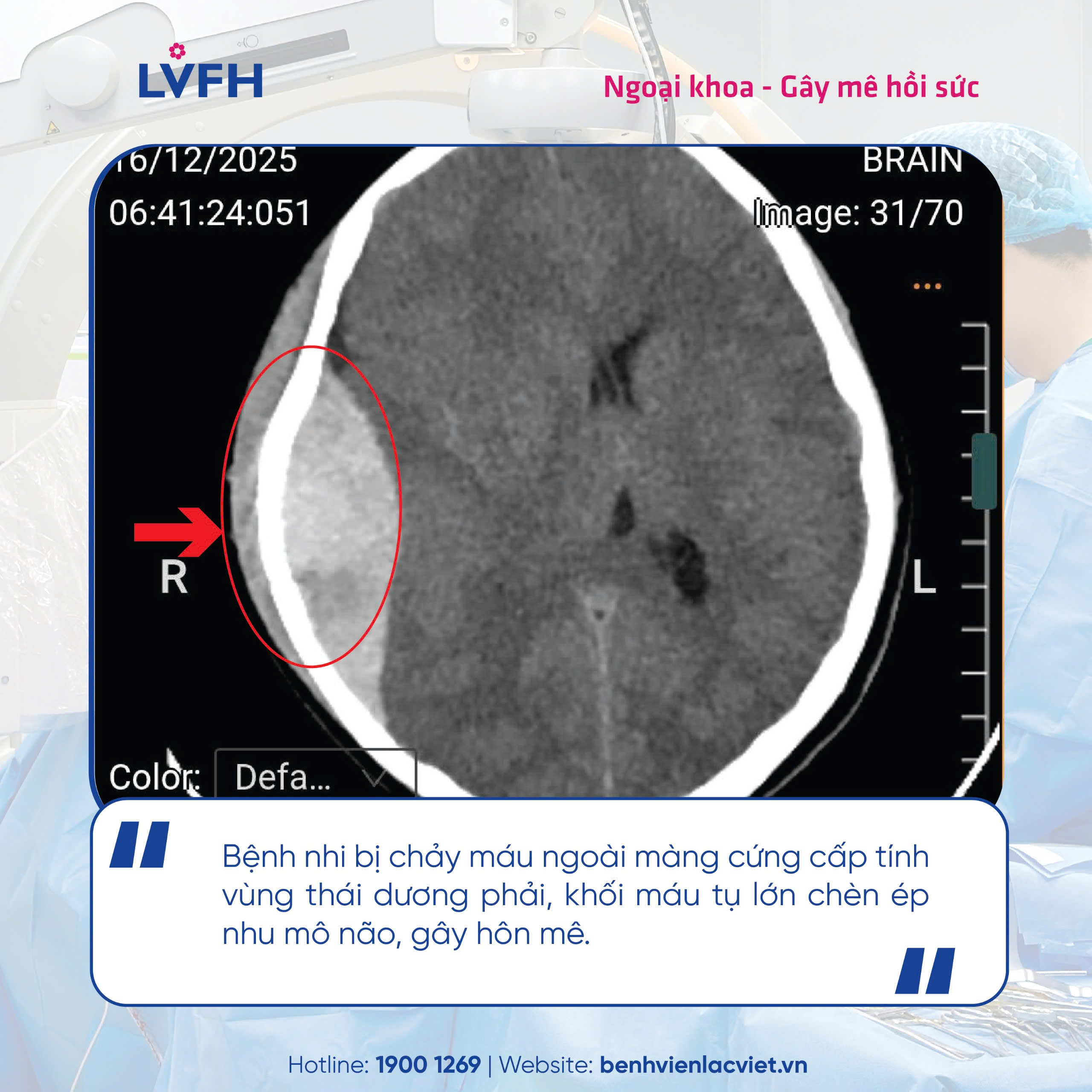 Ngay lập tức, bệnh nhi được chỉ định cho chụp cắt lớp sọ não và phát hiện bị chảy máu ngoài màng cứng cấp tính vùng thái dương phải, khối máu tụ lớn chèn ép nhu mô não, gây hôn mê, đe dọa trực tiếp đến tính mạng.