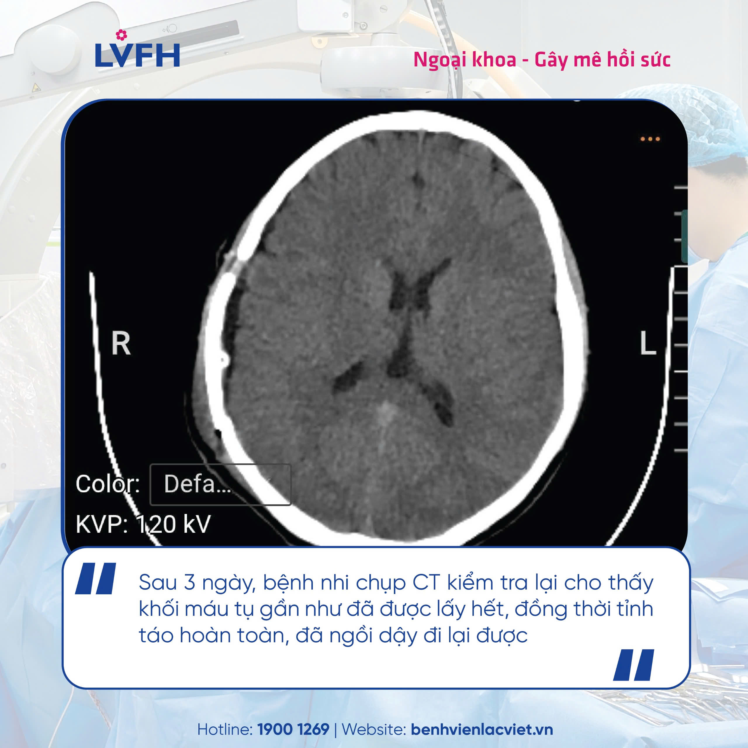 Sau phẫu thuật, bệnh nhi dần ổn định. Sau 3 ngày, bệnh nhi chụp CT kiểm tra lại cho thấy khối máu tụ gần như đã được lấy hết, đồng thời tỉnh táo hoàn toàn, đã ngồi dậy đi lại được. Đến ngày thứ 7, bệnh nhi đã được ra viện.