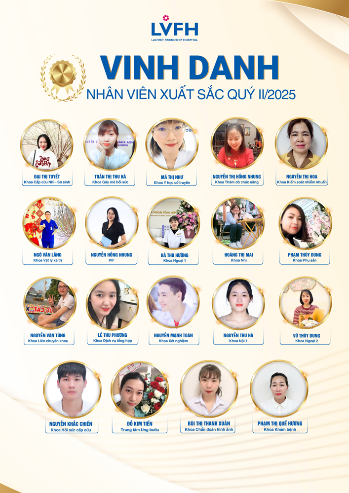 Sau thời gian làm việc hết mình, Bệnh viện Hữu nghị Lạc Việt trân trọng vinh danh 19 cá nhân xuất sắc của Quý II/2025 đã không ngừng nỗ lực và đạt được những thành tích nổi bật trong công việc.