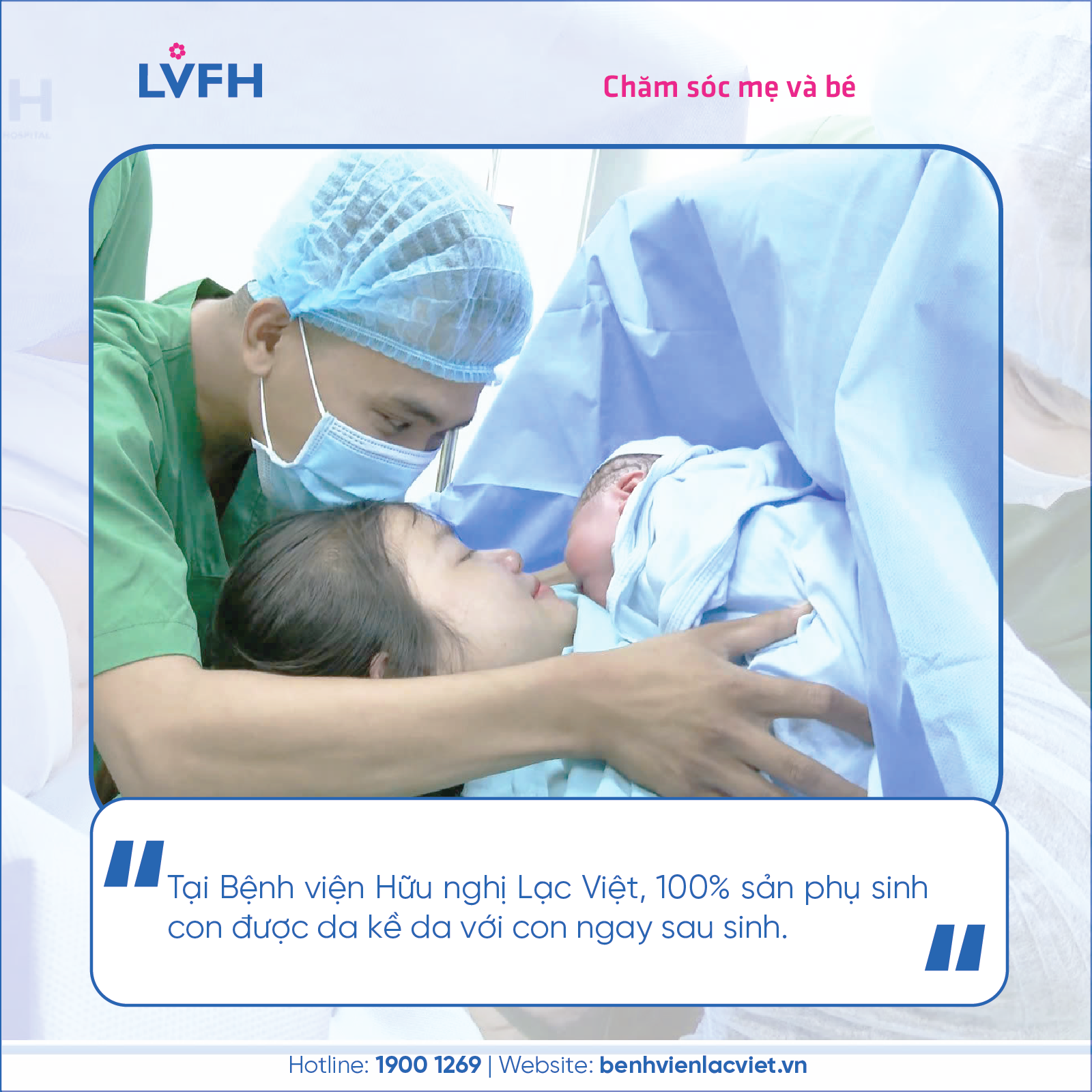 🍀🍀 Tại Bệnh viện Hữu nghị Lạc Việt, 100% sản phụ được thực hiện da kề da với con ngay sau sinh và được hướng dẫn duy trì phương pháp này trong thời gian sau sinh để đảm bảo hiệu quả tối ưu. Với sinh mổ, da kề da vẫn được thực hiện khi mẹ tỉnh táo và sức khỏe ổn định.
