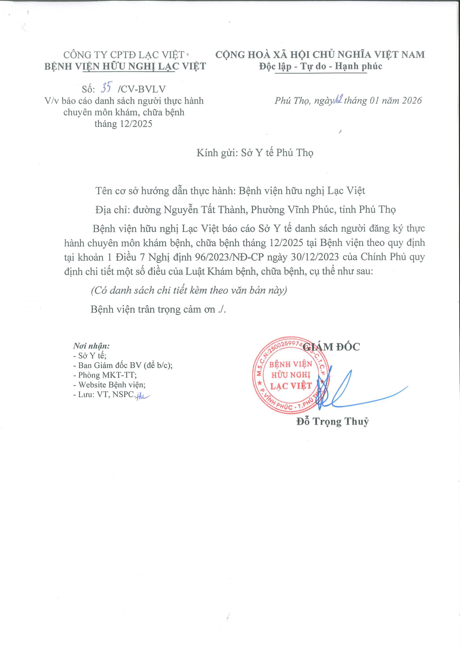 Nhằm thực hiện đúng các quy định về quản lý hoạt động thực hành chuyên môn khám bệnh, chữa bệnh, Bệnh viện Hữu nghị Lạc Việt thông báo Danh sách người đăng ký và hoàn thành thực hành chuyên môn khám bệnh, chữa bệnh tại Bệnh viện trong tháng 12/2025, được tổng hợp và báo cáo theo quy định hiện hành. Danh sách chi tiết được đính kèm dưới đây để các cá nhân và đơn vị liên quan tiện theo dõi, tra cứu.
