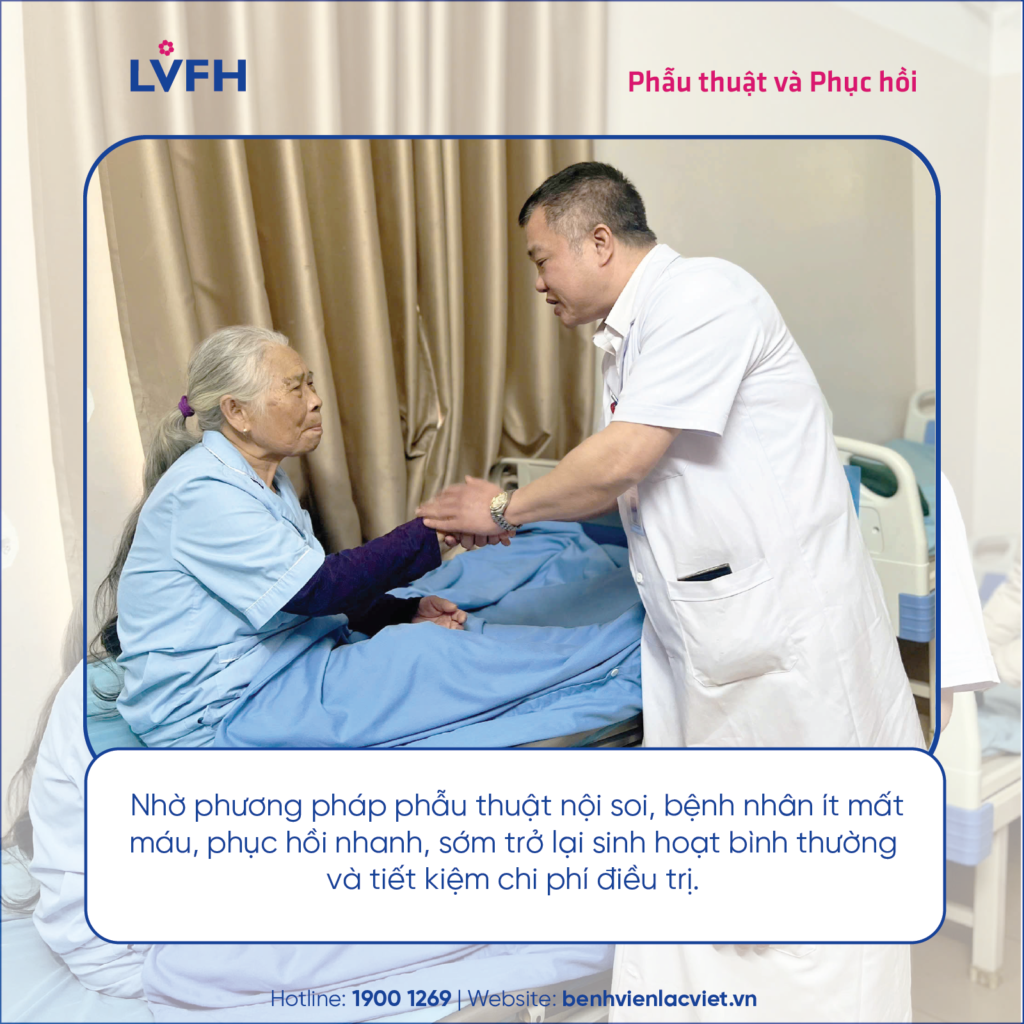 ThS. BS CKII Triệu Hồng Phong – Phó Giám đốc Bệnh viện Hữu nghị Lạc Việt Phúc Yên cho biết: “Mặc dù bệnh nhân lớn tuổi và có nhiều bệnh nền, nhưng với sự tiến bộ của y học, chúng tôi đã lựa chọn phương pháp phẫu thuật nội soi cố định tử cung vào giải chậu lược hai bên. Ưu điểm của mổ nội soi là ít mất máu, phục hồi nhanh, thời gian nằm viện ngắn, chỉ từ 3 đến 4 ngày là được xuất viện, giúp người bệnh sớm trở lại sinh hoạt bình thường và tiết kiệm chi phí điều trị”.