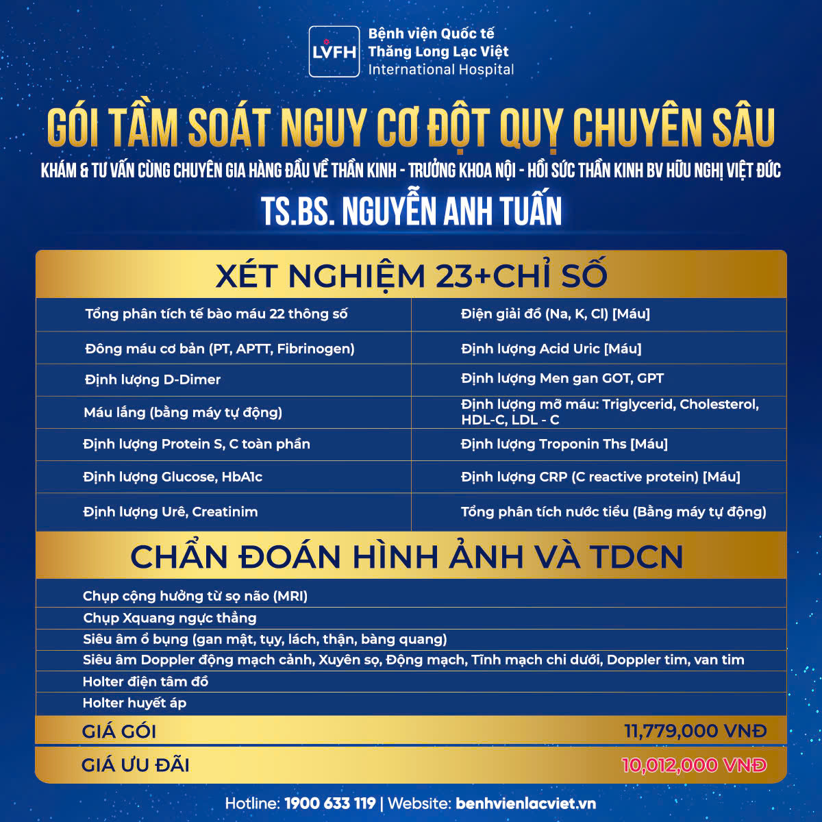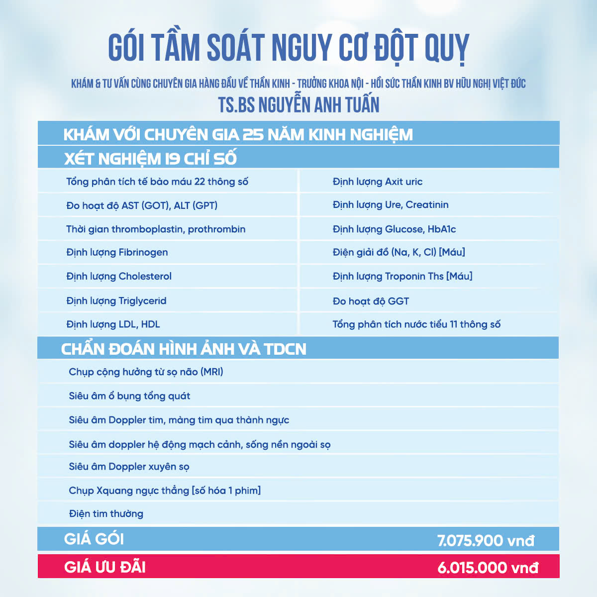 Gói khám được xây dựng bởi TS.BS Nguyễn Anh Tuấn cùng đội ngũ y bác sĩ giàu kinh nghiệm, với rất nhiều danh mục thăm khám chuyên sâu:
