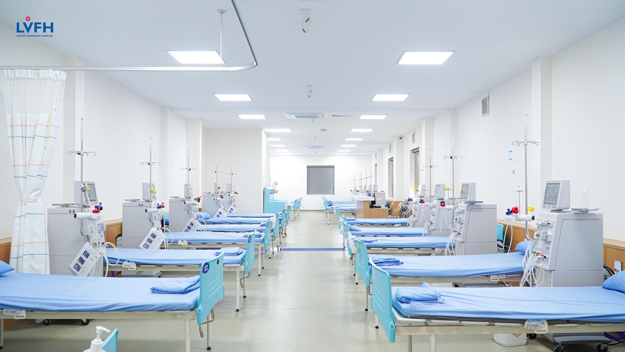 Đơn nguyên Thận – Lọc máu, Bệnh viện hữu nghị Lạc Việt với không gian rộng rãi, riêng biệt đáp ứng nhu cầu chạy thận nhân tạo lên tới 100 bệnh nhân/ngày.