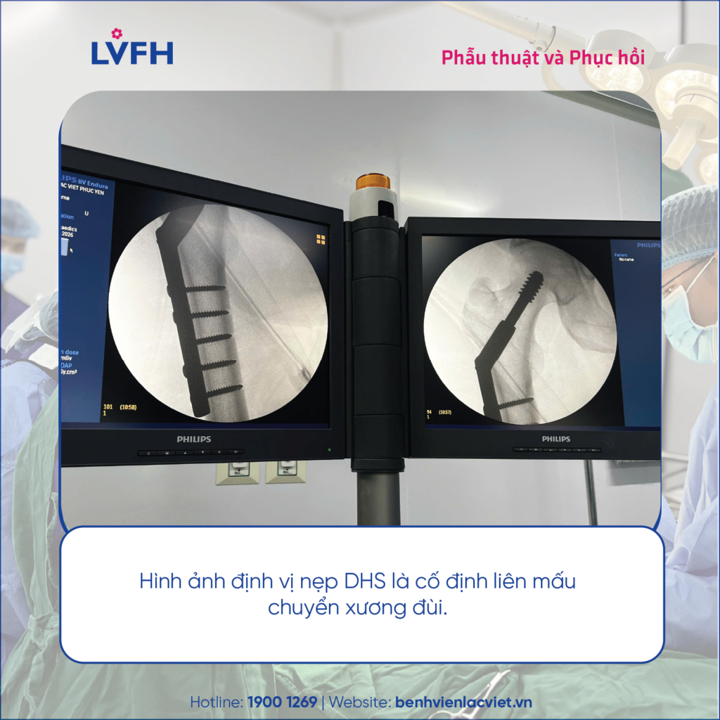 Trước tình trạng nguy cấp, ê kíp bác sĩ Khoa Ngoại – Sản – Gây mê hồi sức đã khẩn trương tiến hành phẫu thuật cấp cứu, áp dụng phương pháp cố định bằng nẹp DHS kết hợp xuyên đinh kín dưới hướng dẫn của hệ thống C-arm.