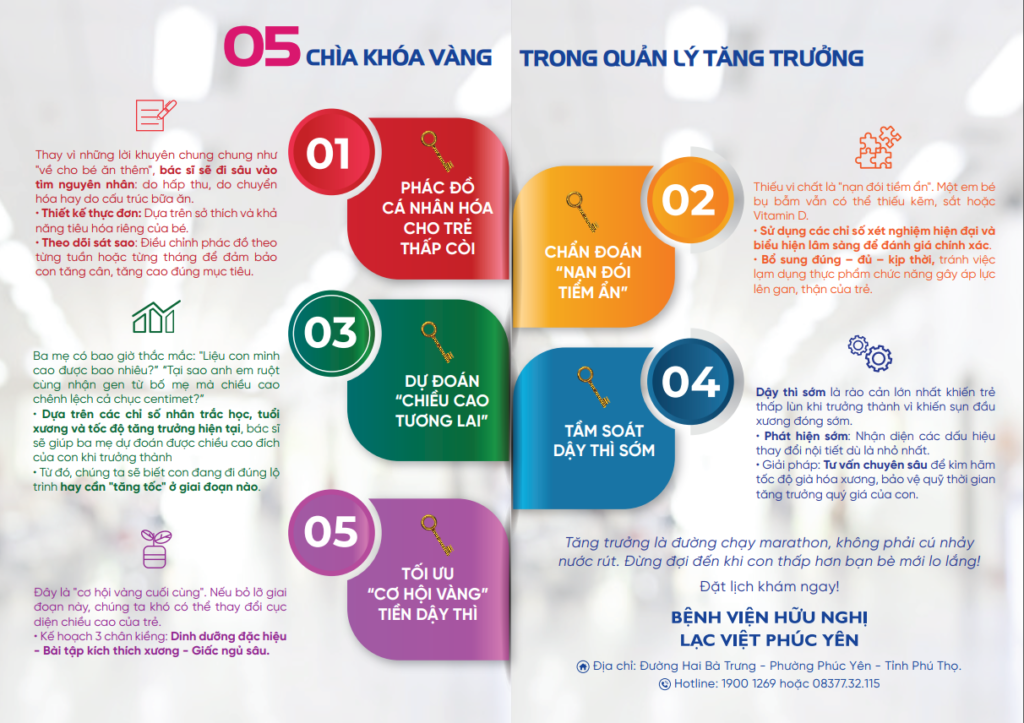 5️⃣ Tối ưu “Cơ hội vàng” Tiền dậy thì: Đây là giai đoạn bứt phá cuối cùng (có thể tăng 8-12cm/năm). Bác sĩ sẽ thiết lập “Kiềng 3 chân”: Dinh dưỡng đặc hiệu – Bài tập kích thích – Giấc ngủ sâu.