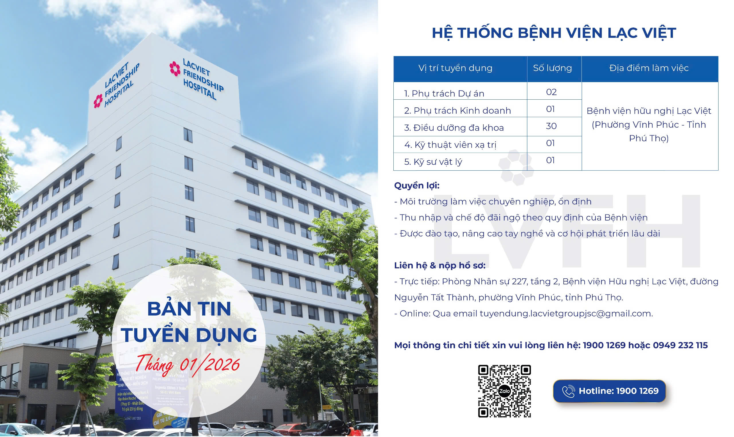 📍 Địa điểm làm việc: Bệnh viện Hữu Nghị Lạc Việt, Đường Nguyễn Tất Thành, phường Vĩnh Phúc, tỉnh Phú Thọ.