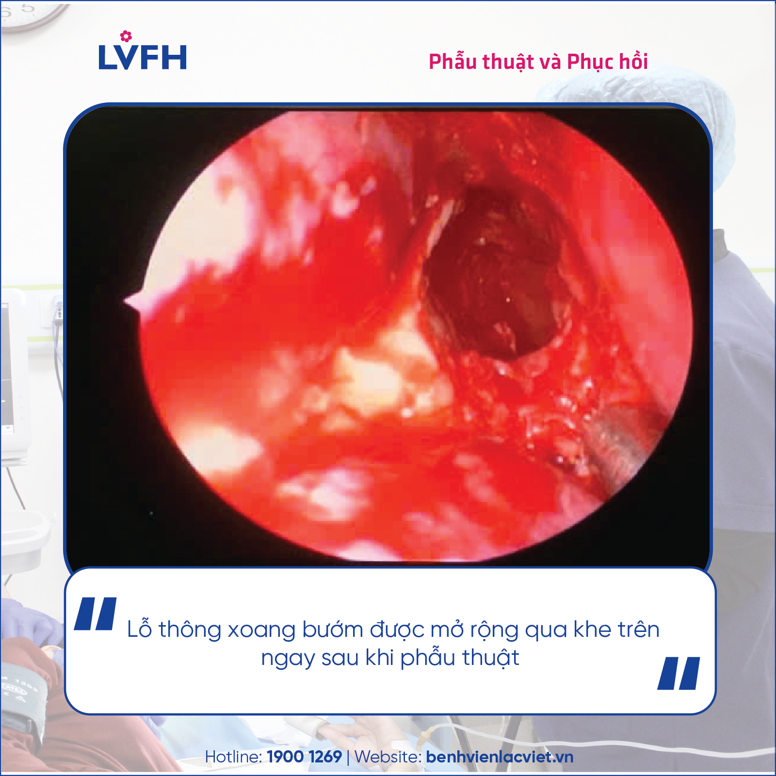 Ngay sau đó, bệnh nhân được chỉ định phẫu thuật nội soi xoang bướm để làm sạch tổn thương và lấy bệnh phẩm phục vụ chẩn đoán giải phẫu bệnh. Sau 2 tuần phẫu thuật, bệnh nhân không còn chảy dịch mũi, hết đau đầu, đã tái khám 2 lần và hiện sức khỏe ổn định.